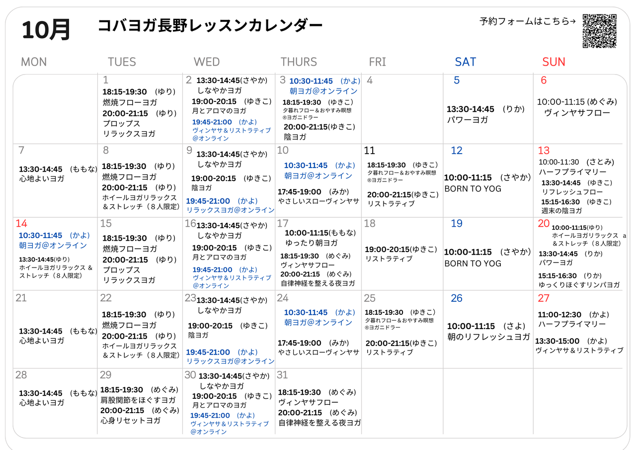 10月のクラススケジュールをアップします。朝晩が肌寒くなってきましたね